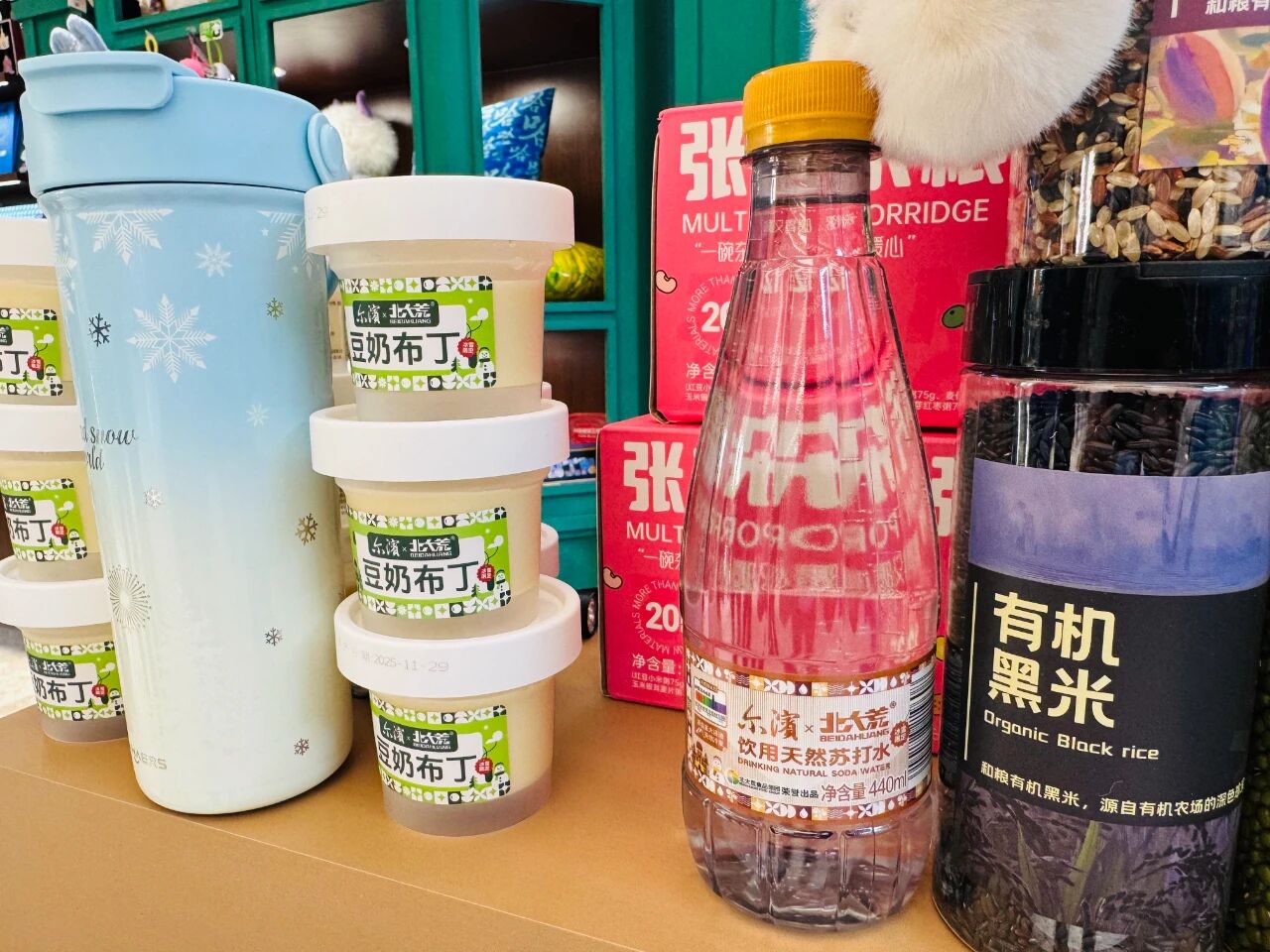 在联名产品展示区,北大荒豆乳布丁的绵密香甜、北大荒矿泉水的甘冽清爽,获得与会嘉宾一致认可,现场品鉴环节更是好评如潮。值得关注的是,联名款苏打水已成功成为东方航空公司机上指定用水,相关产品海报同步登陆机上杂志专栏,通过航空场景实现精准触达,显著提升了联名品牌的全国曝光度与市场影响力。