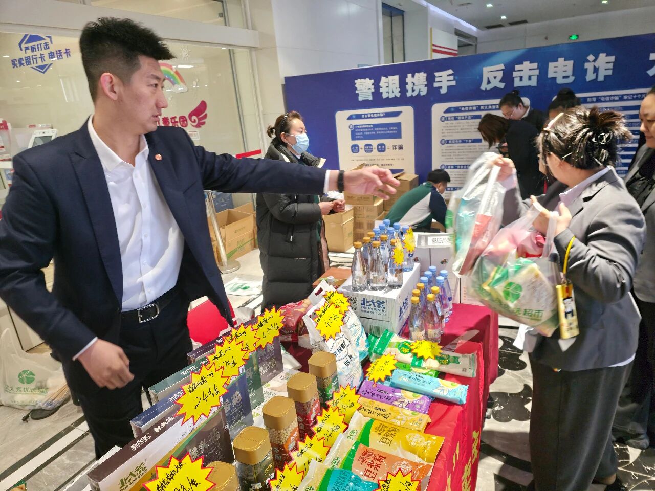 本次活动中,食品集团精准对接金融系统需求特点,量身定制分层分级供应方案,将展销专区设于中信银行黑龙江省分行营业大厅核心区域。现场整齐陈列米、面、油、有机杂粮、山特产品等10余个品类的核心优势产品,全方位展现北大荒黑土物产的优质特质。专业的产品推介吸引众多客户及市民驻足咨询、互动体验,现场下单氛围热烈,成果颇丰。同时,活动创新采用“线下体验+线上直达”融合服务模式,通过线下沉浸式感受与线上便捷采购的双向赋能,全面满足不同消费群体的多样化需求。