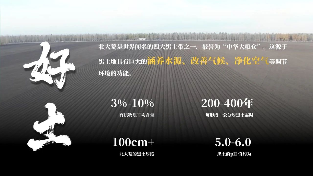 北大荒这个被誉为“中华大粮仓”的地方,这里的黑土地具有巨大的涵养水源、净化空气等调节环境的功能。黑土都分布在四季分明的寒温带,黑土有机物质平均含量在3%~10%,有机质含量大约是黄土的十倍,人们总用“一两土二两油”来形容它的肥沃与珍贵。