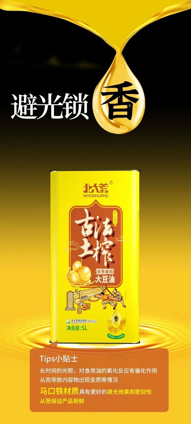 全新升级的古法土榨大豆油,采用马口铁的包装材质,保证产品新鲜品质。