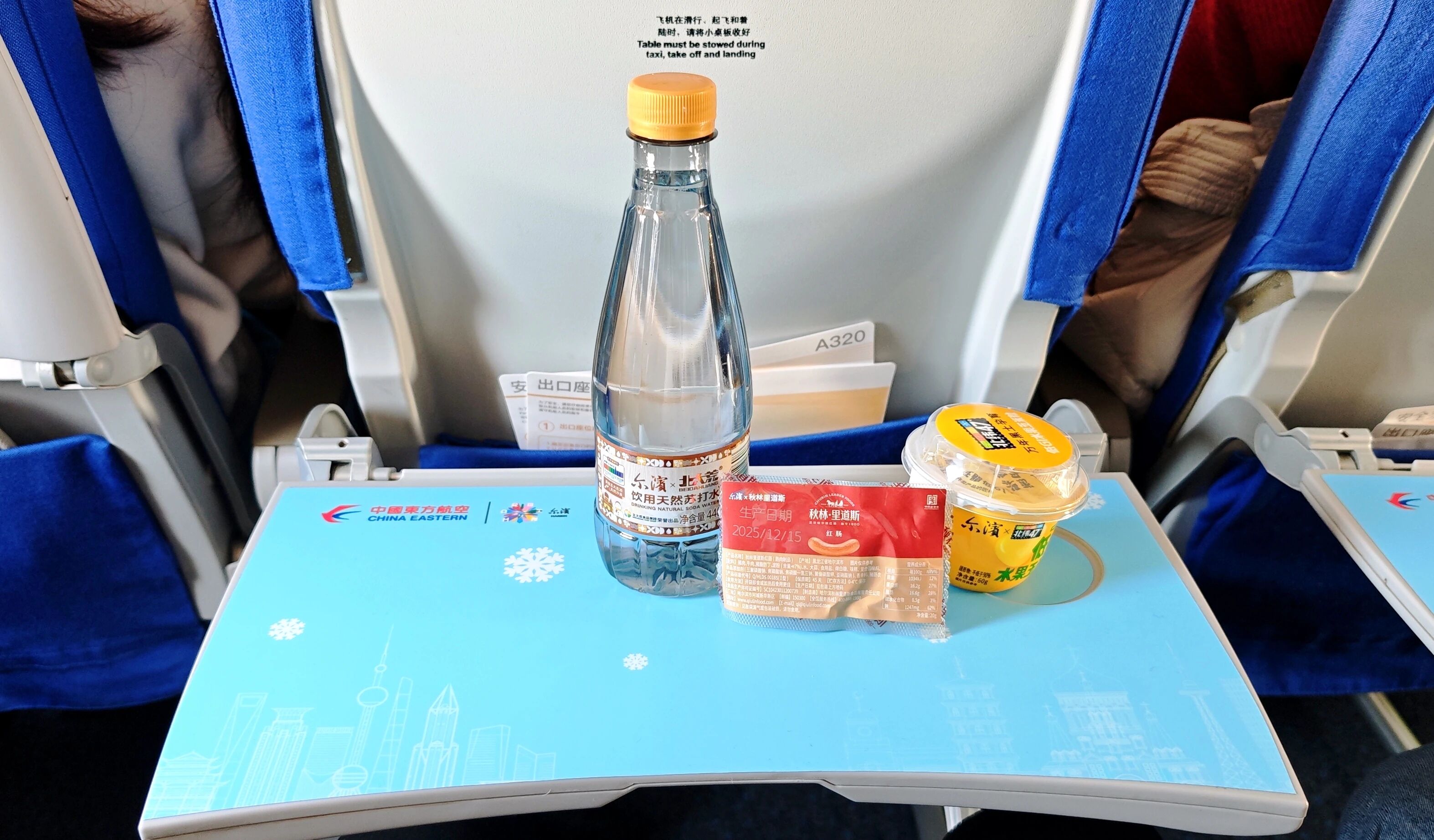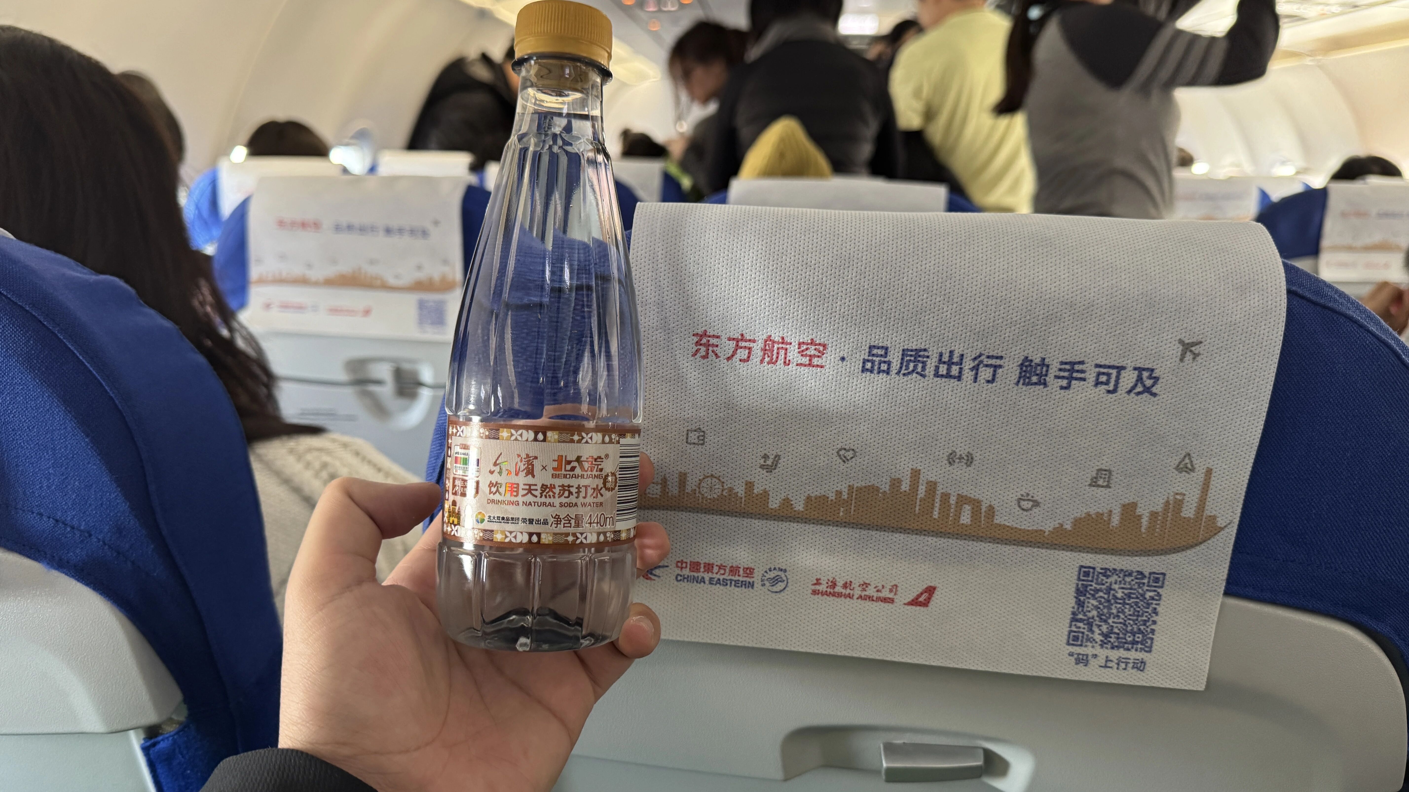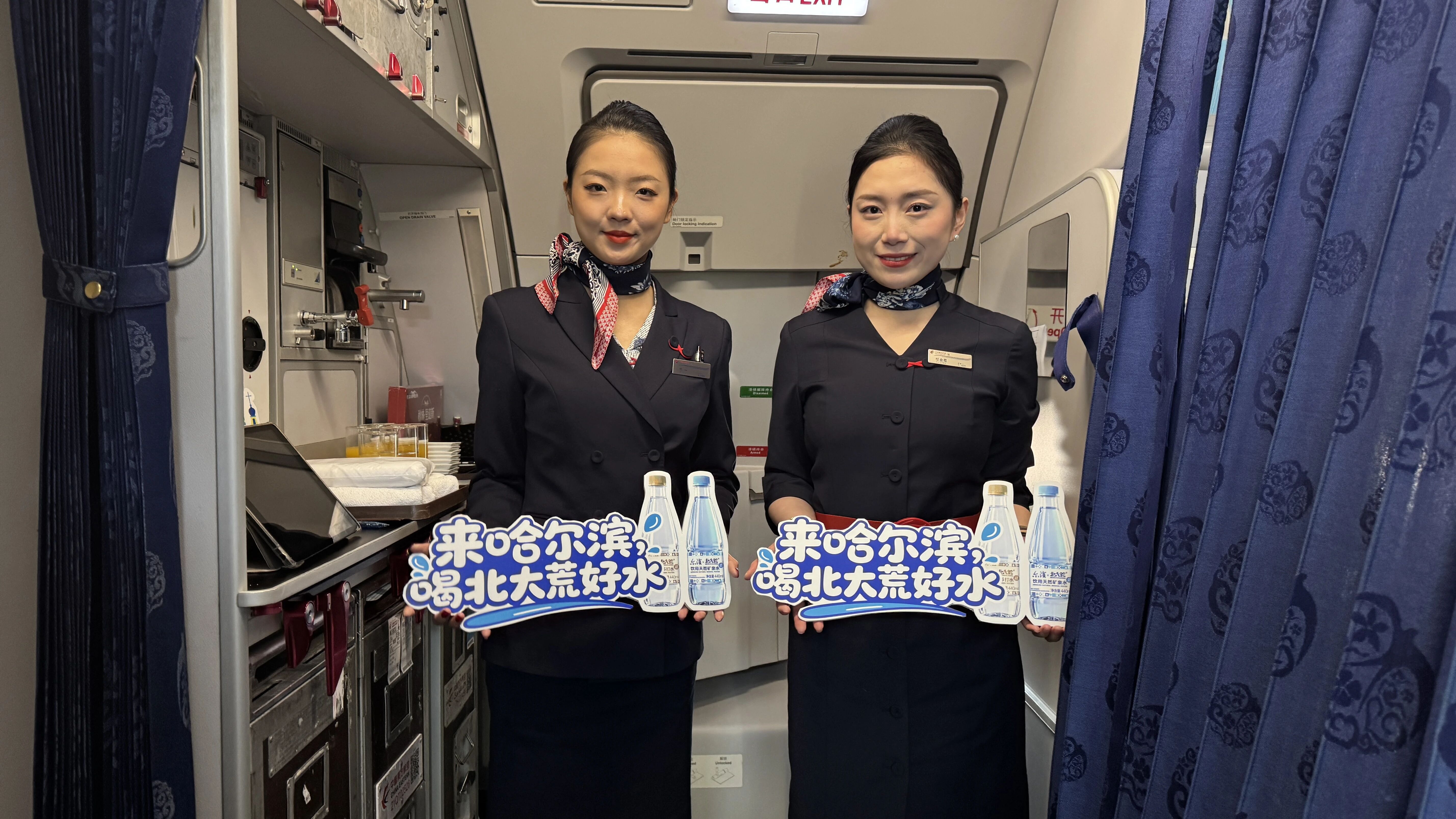 在“冰雪主题空中客厅”的航班内,北大荒苏打水的身影随处可见。客舱展示架上陈列着其联名款产品,“来哈尔滨 喝北大荒好水”的品牌标语与舷窗冰雪窗花、亚冬会吉祥物“滨滨”“妮妮”头片共同营造出浓郁的北国风情。乘务员身着融入雪花元素的制服,为旅客送上暖心礼包时,特意搭配了定制款北大荒苏打水。